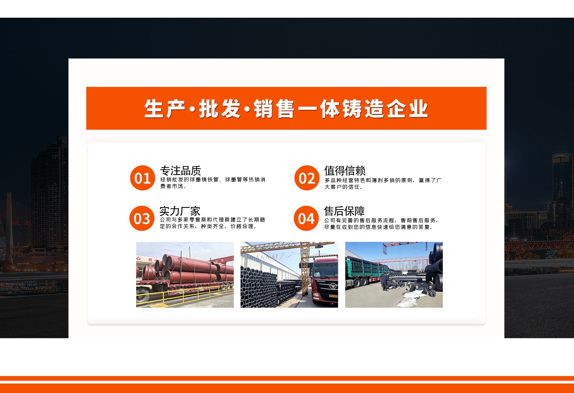 青島金源達(dá)管業(yè)有限公司主要經(jīng)營各種規(guī)格球墨鑄鐵管,球墨管,球墨鑄鐵管廠家等產(chǎn)品,質(zhì)量可靠,誠信經(jīng)營,值得信賴! 青島金源達(dá)管業(yè)有限公司始終堅持“誠信立業(yè),追求卓越,合作共贏,共同發(fā)展”,竭誠歡迎各界朋友來廠參觀指導(dǎo),洽談業(yè)務(wù)。我們愿與您攜手共進,互惠雙贏,共創(chuàng)未來! 公司堅持“以奮斗者為本”的理念,關(guān)心關(guān)愛職工,職工的獲得感、幸福感更加充實、更有保障、更可持續(xù);秉承“忠誠企業(yè)、勇于擔(dān)當(dāng)、開拓創(chuàng)新、主動作為”,堅持黨建領(lǐng)航、創(chuàng)新驅(qū)動、文化塑魂、奉獻社會,全面致力于綠色、低碳、高效、高質(zhì)量發(fā)展。 愿與各界朋友攜手并進,共創(chuàng)未來!...